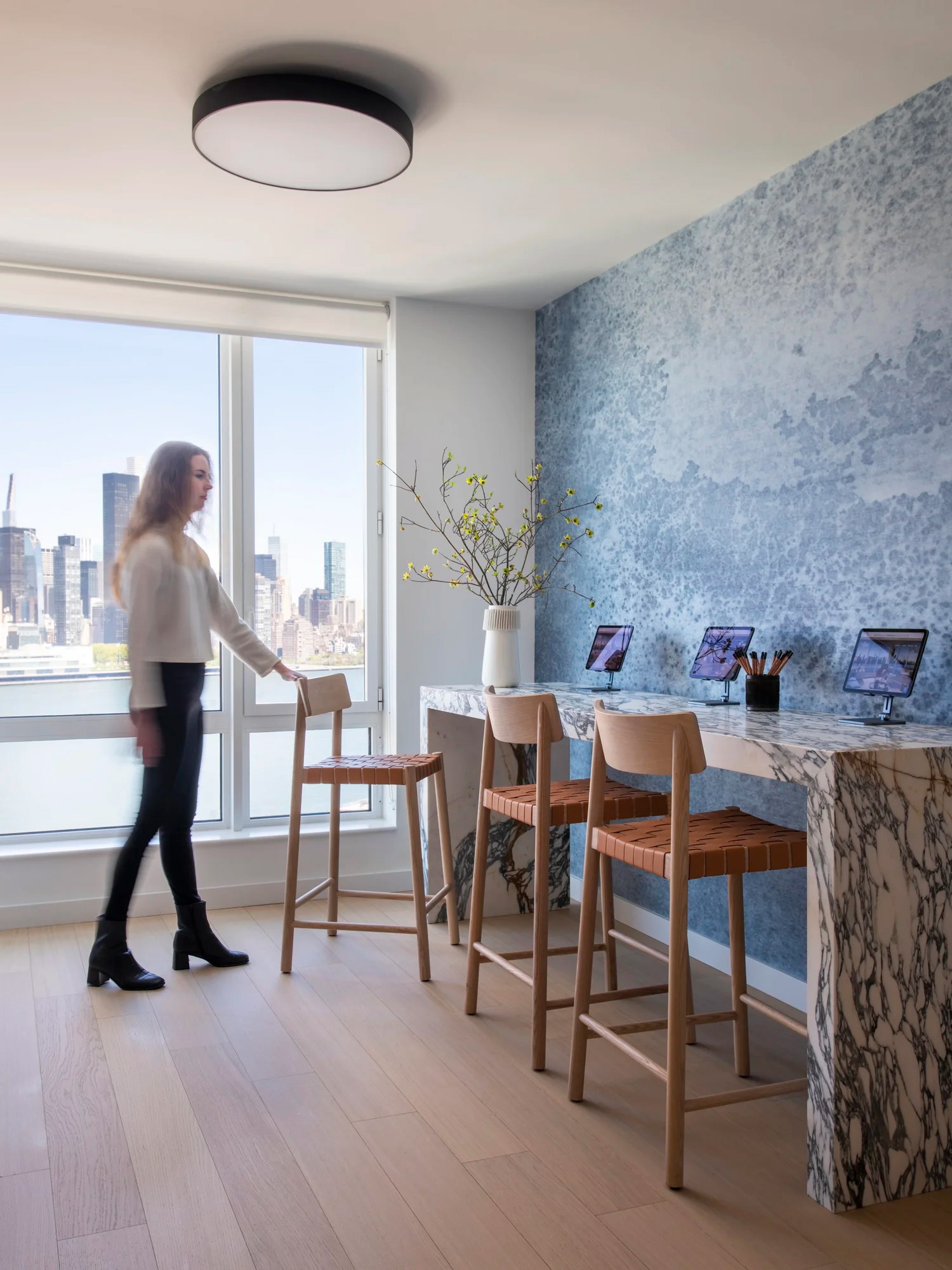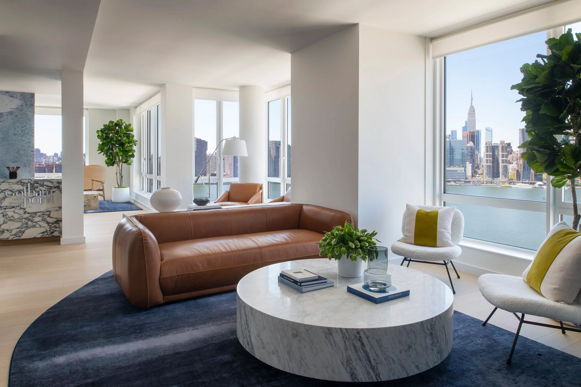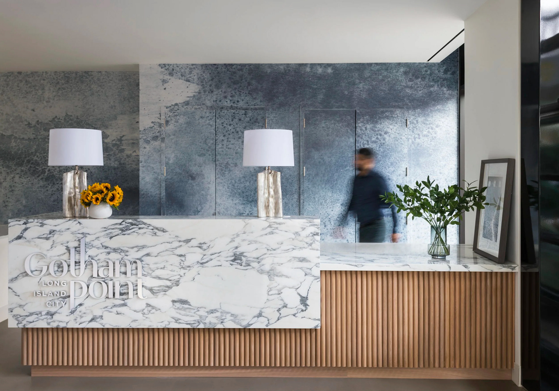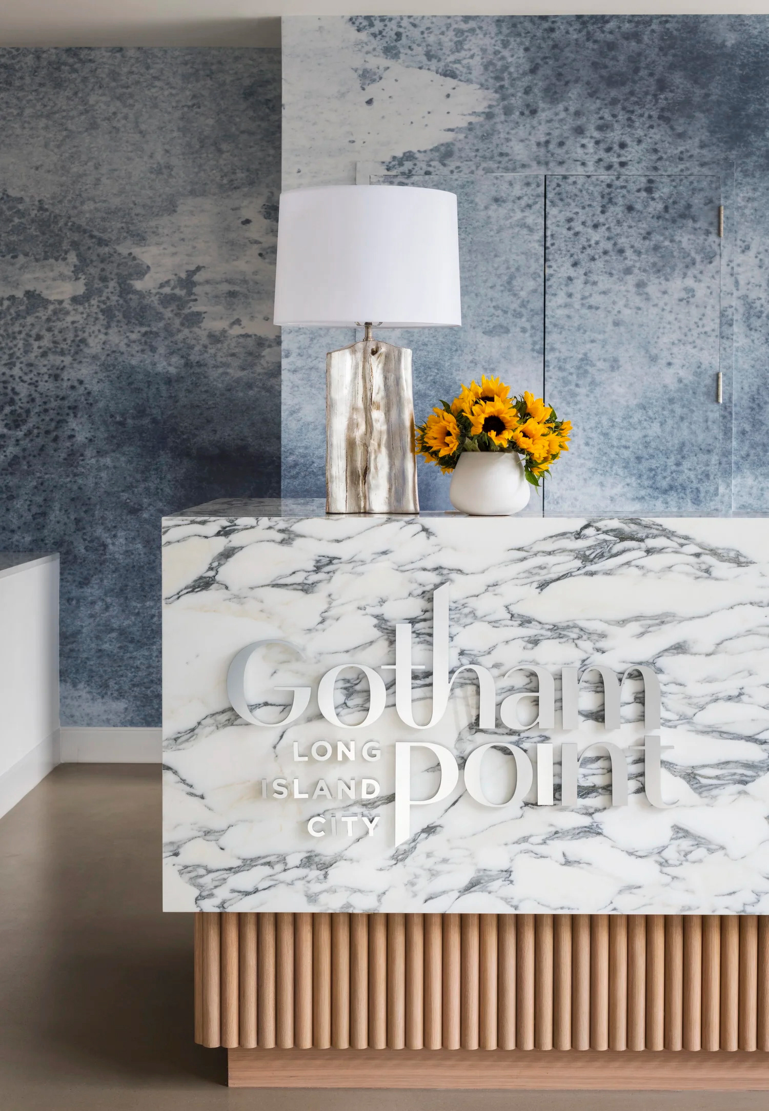BHDM DESIGN DIRECTOR Inspired by Gotham’s waterfront setting in Long Island City, we designed a light-filled leasing gallery rooted in natural materials and tonal texture. Custom wallpaper and carpet patterns subtly referenced the movement of water, creating a refined, open plan environment that feels both grounded and expansive.