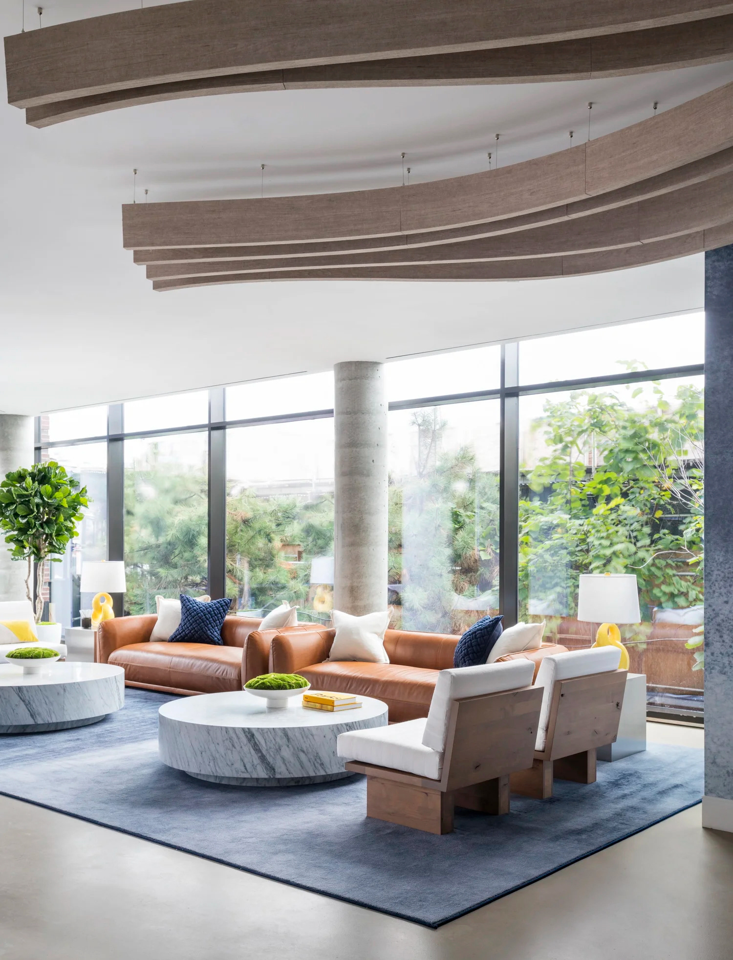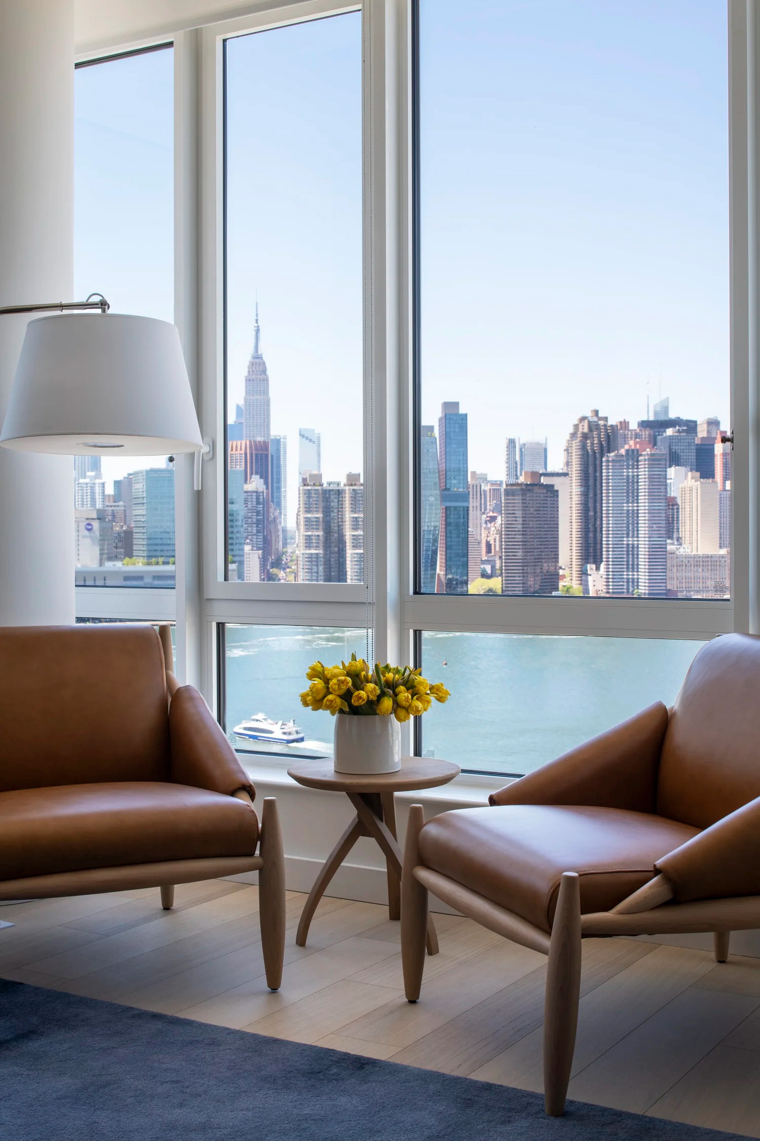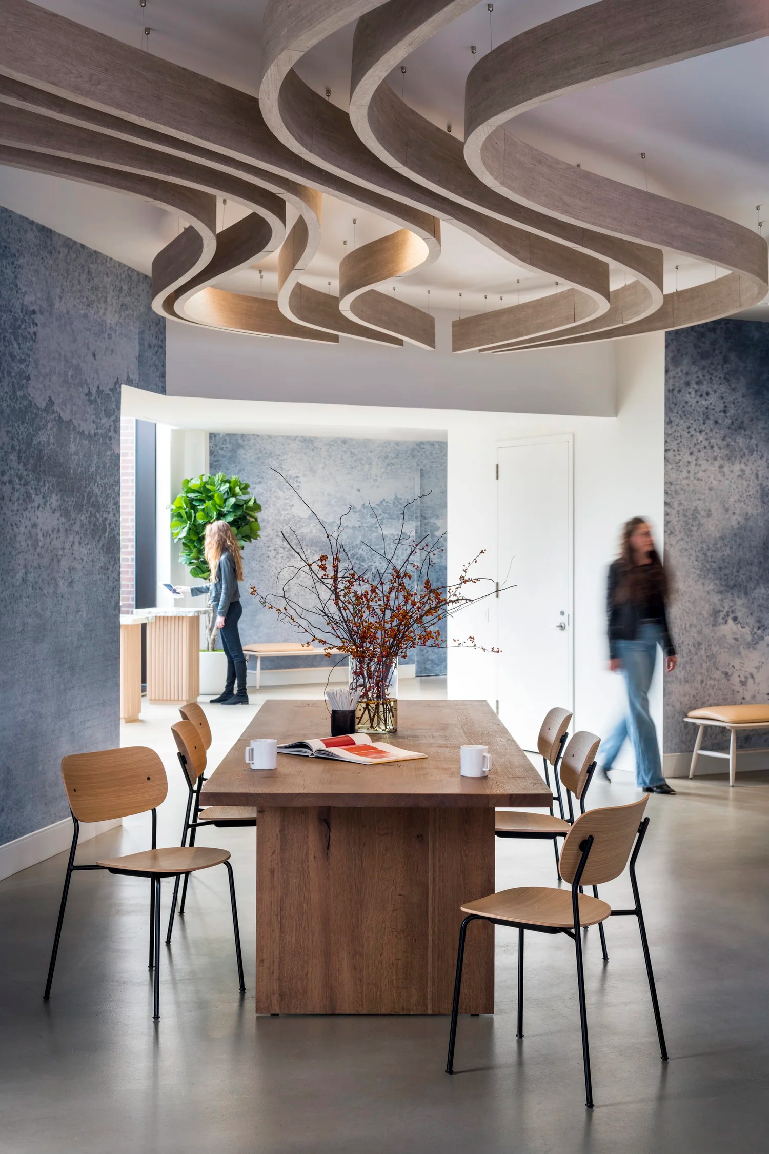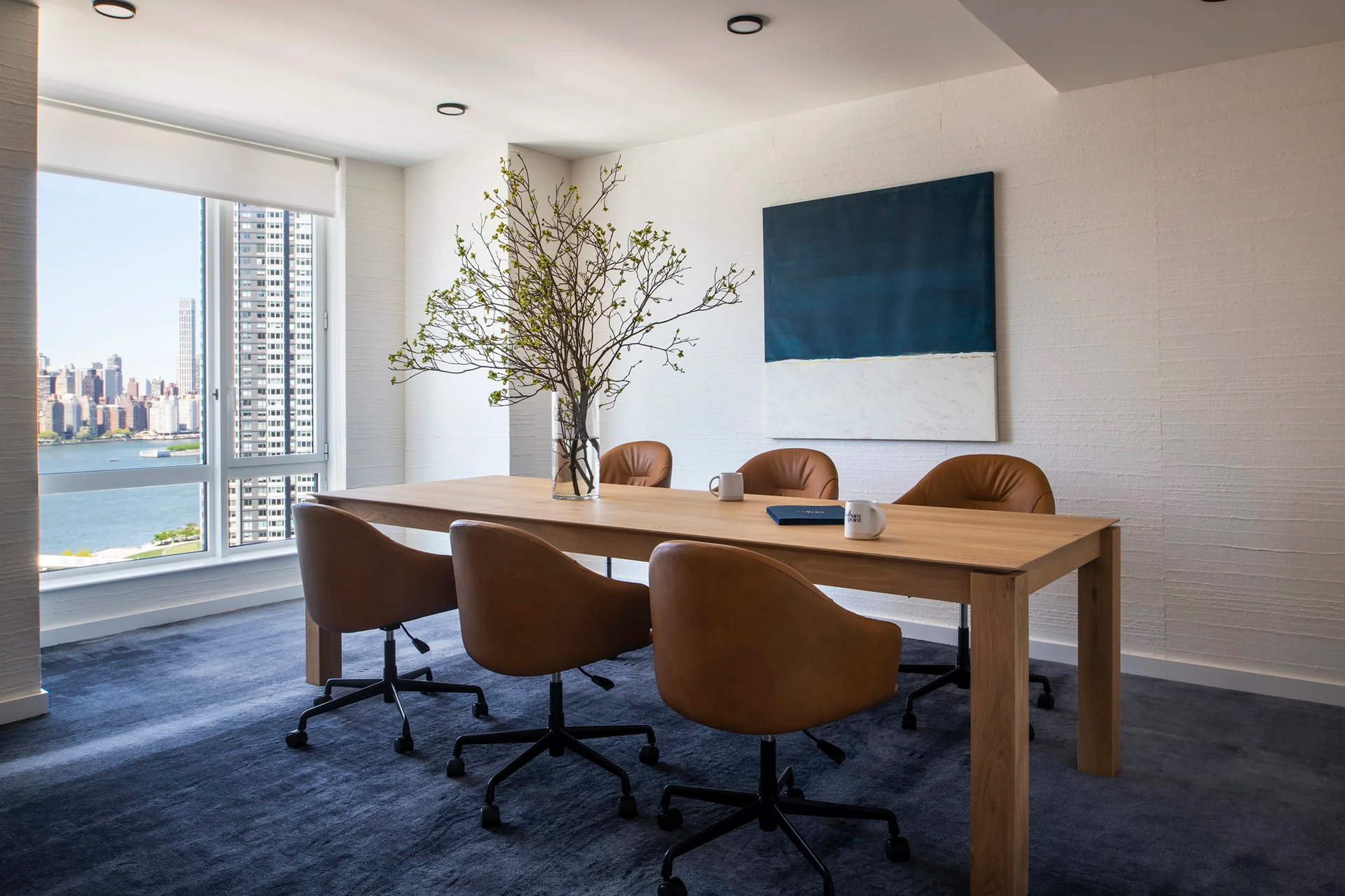 BHDM DESIGN DIRECTOR Inspired by Gotham’s waterfront setting in Long Island City, we designed a light-filled leasing gallery rooted in natural materials and tonal texture. Custom wallpaper and carpet patterns subtly referenced the movement of water, creating a refined, open plan environment that feels both grounded and expansive.