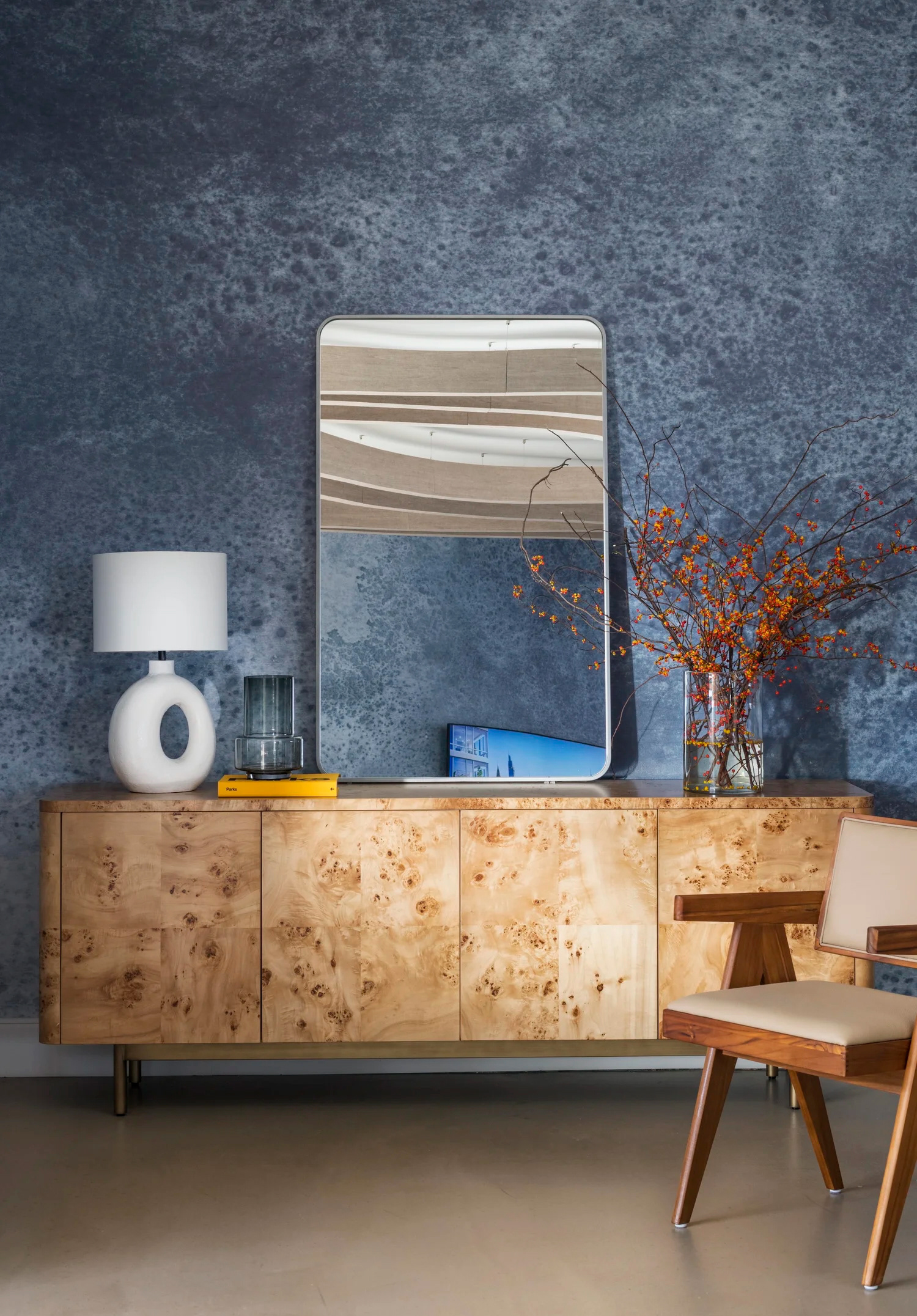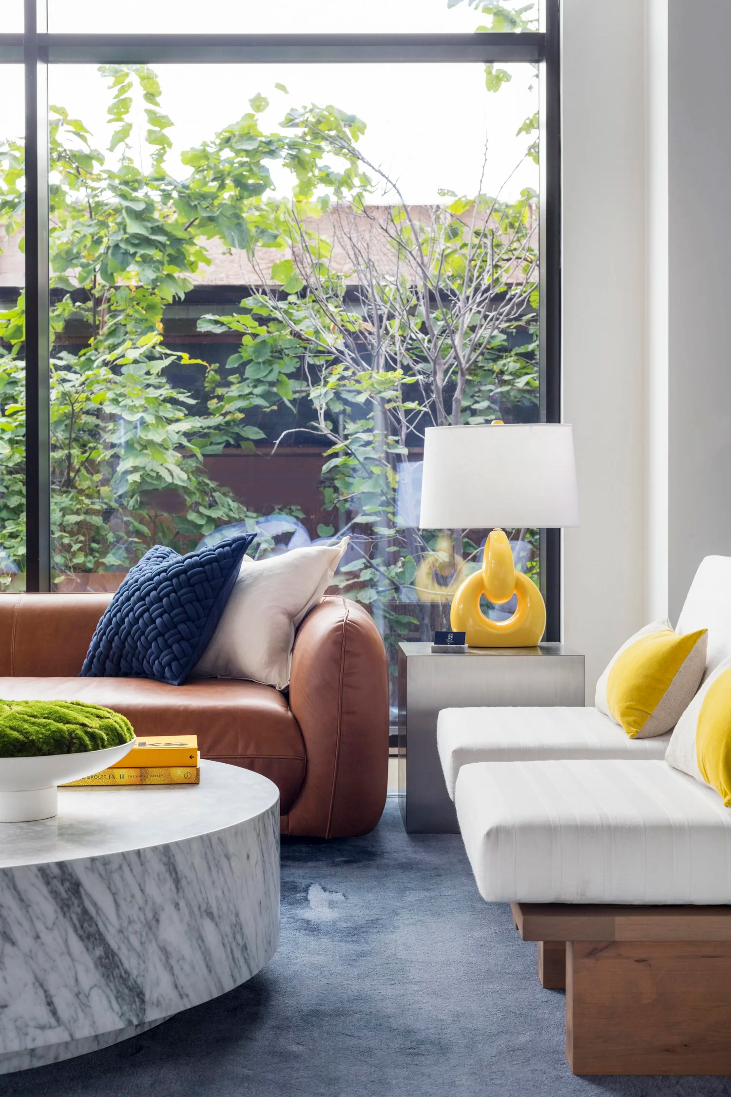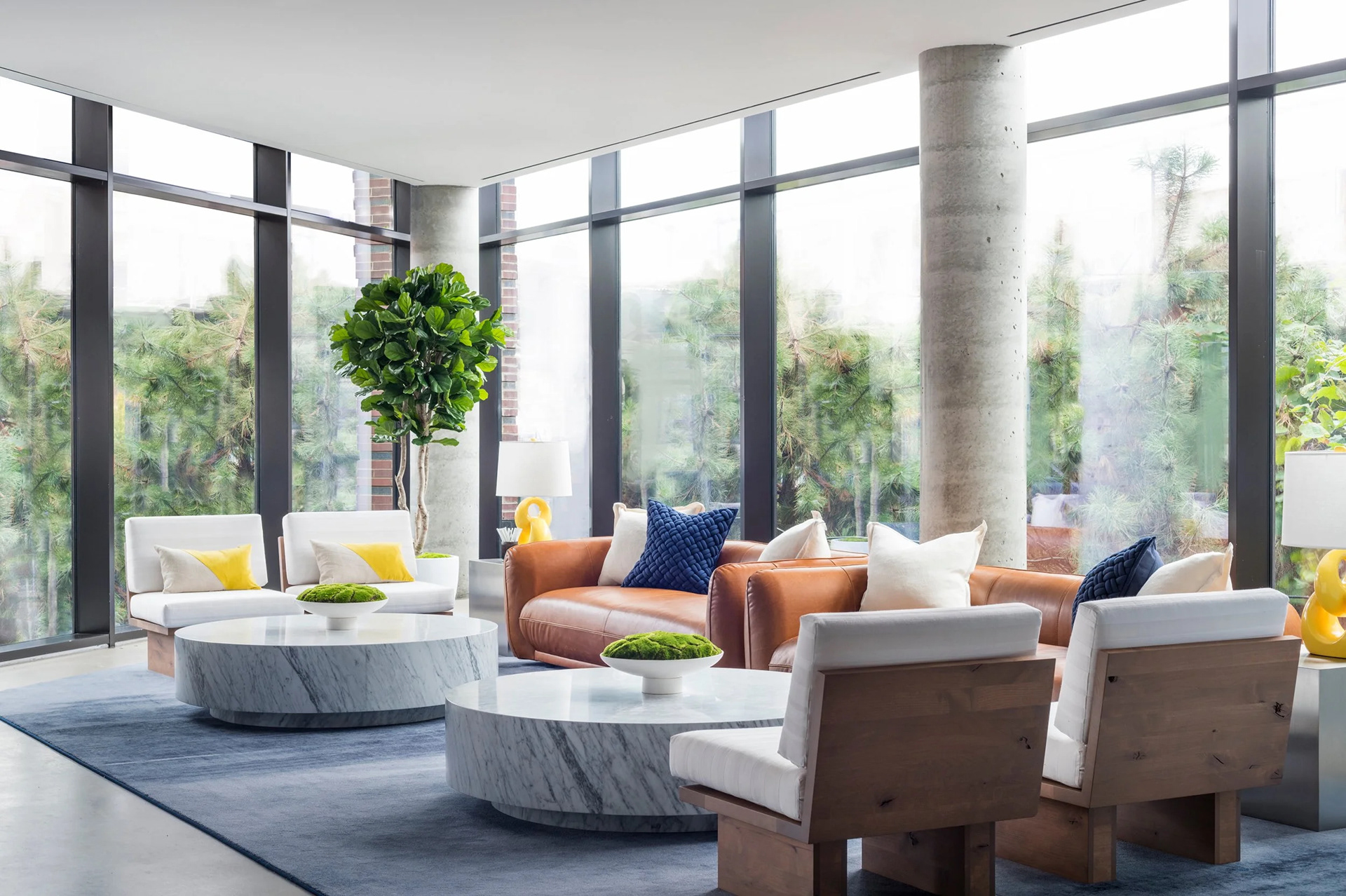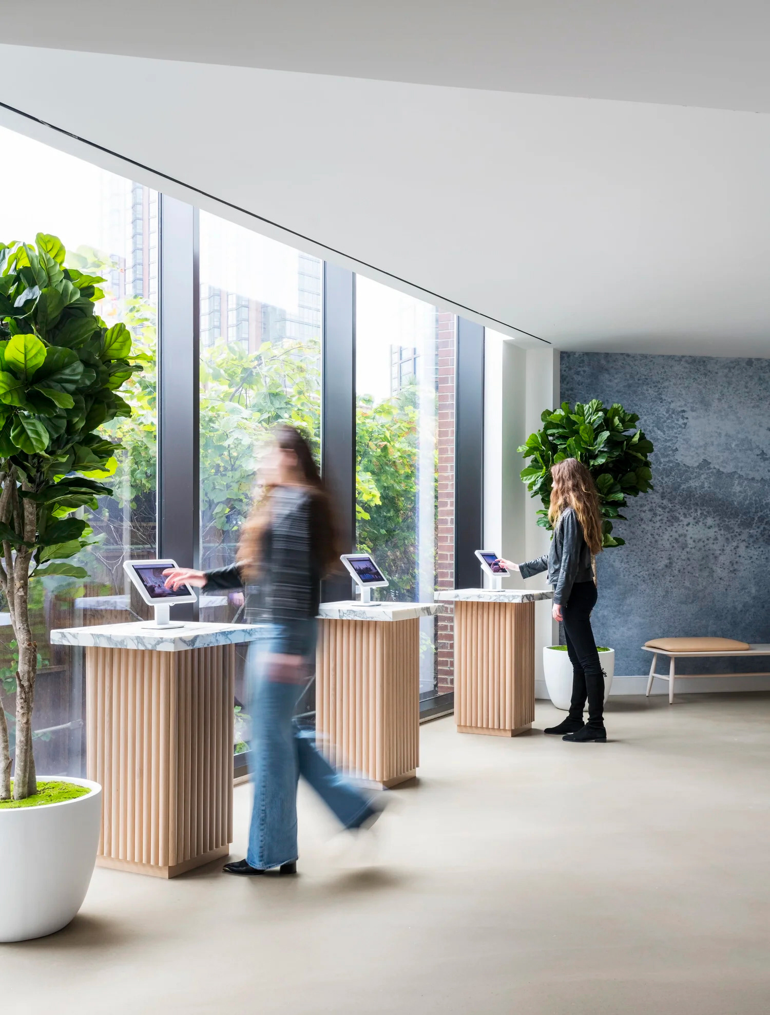 BHDM DESIGN DIRECTOR Inspired by Gotham’s waterfront setting in Long Island City, we designed a light-filled leasing gallery rooted in natural materials and tonal texture. Custom wallpaper and carpet patterns subtly referenced the movement of water, creating a refined, open plan environment that feels both grounded and expansive.