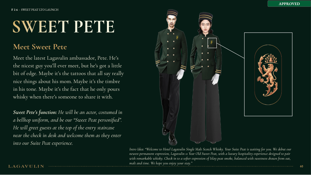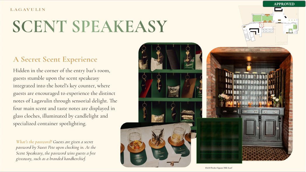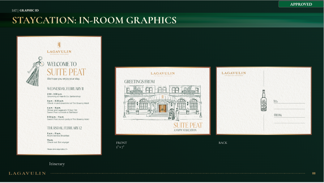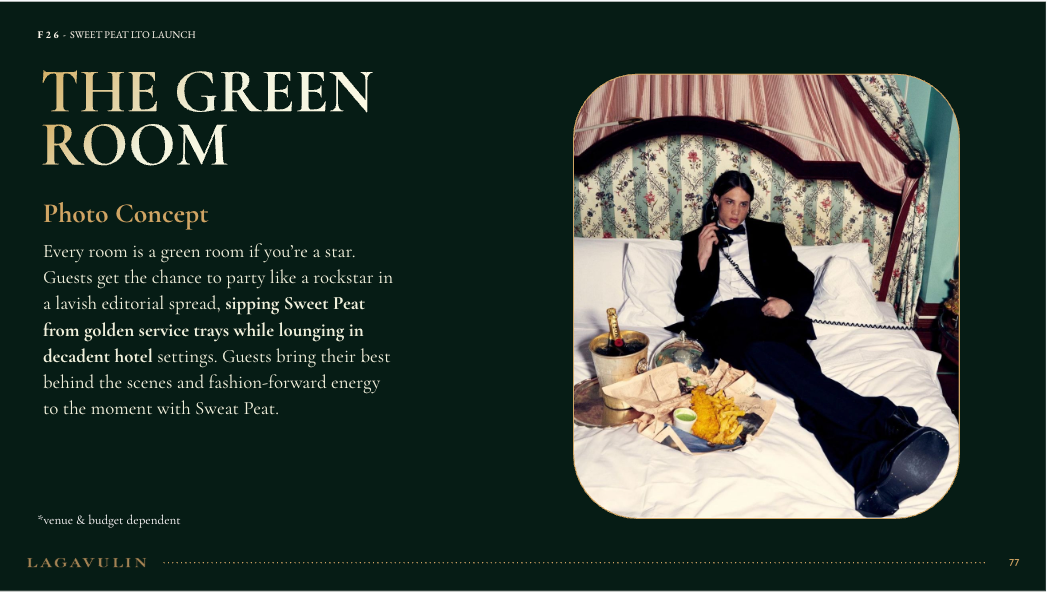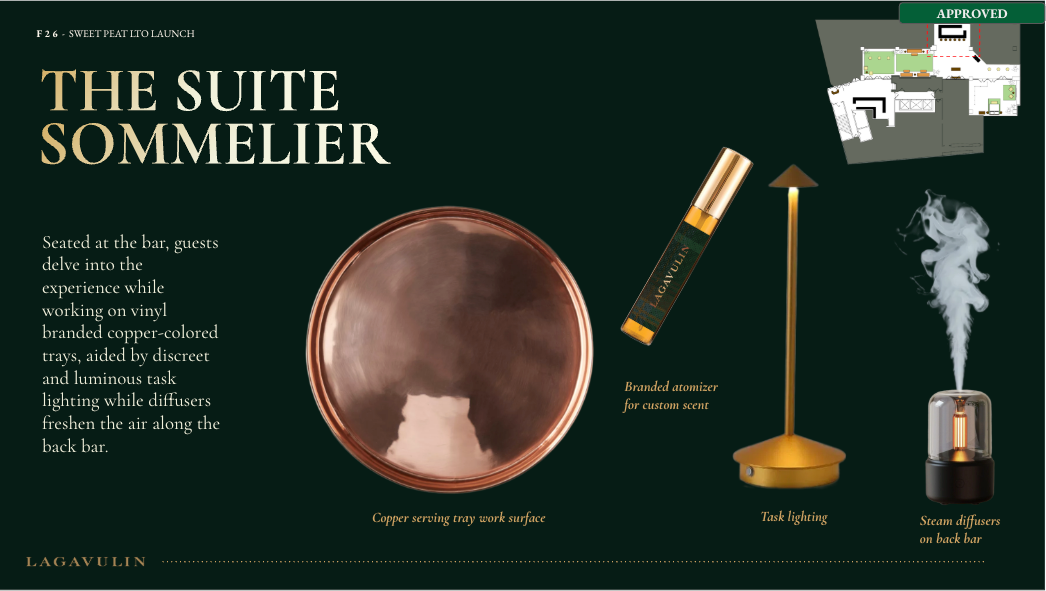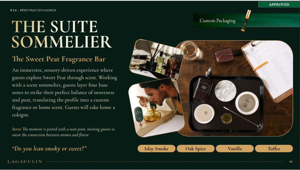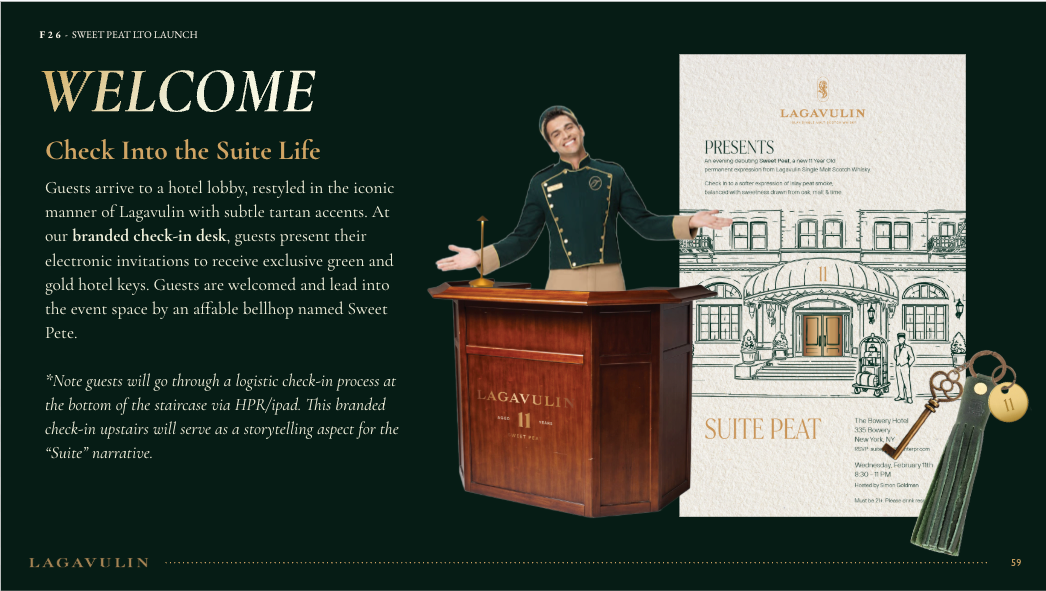 NVE CREATIVE DIRECTOR We transformed Lagavulin’s Sweet Peat launch into “Suite Peat,” an immersive hotel-inspired world unveiled during New York Fashion Week. Through theatrical hospitality, interactive scent rituals, and elevated signature serves, media and tastemakers experienced the whisky in a layered, fashion-forward setting designed to spark discovery and connection.