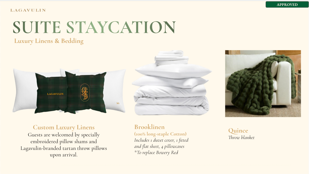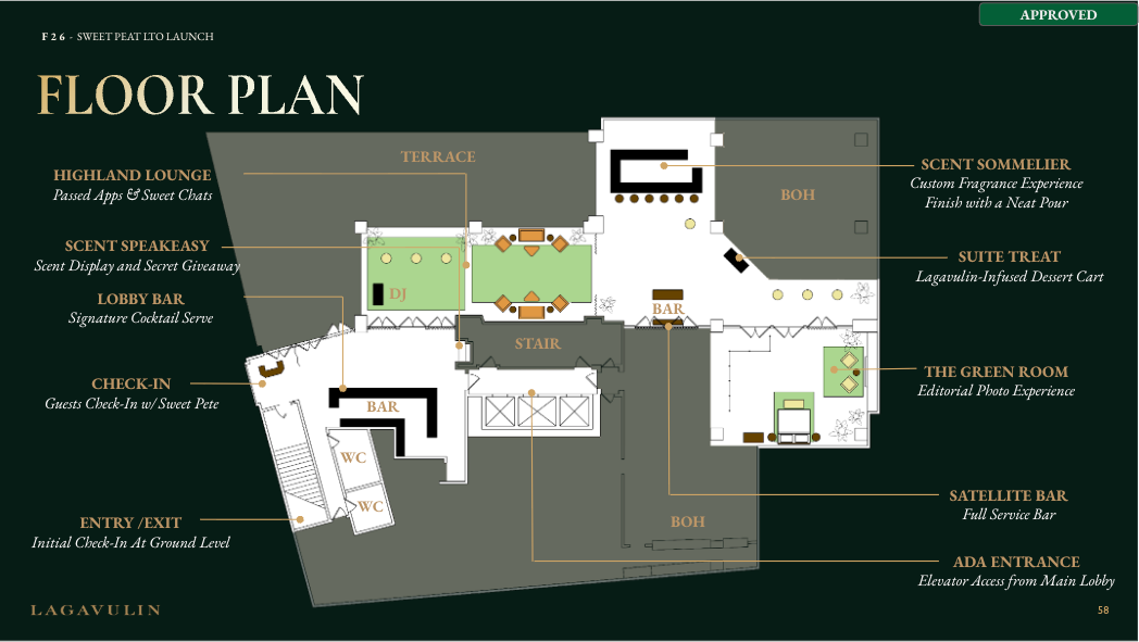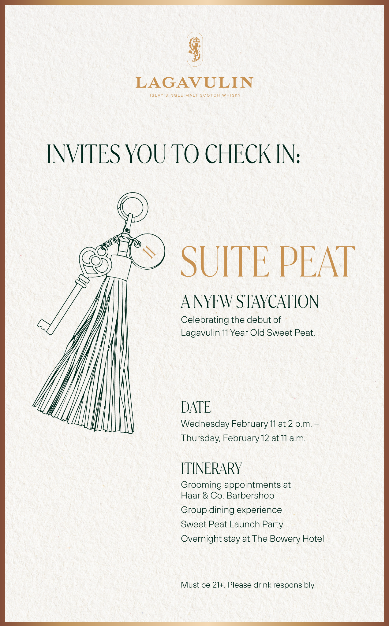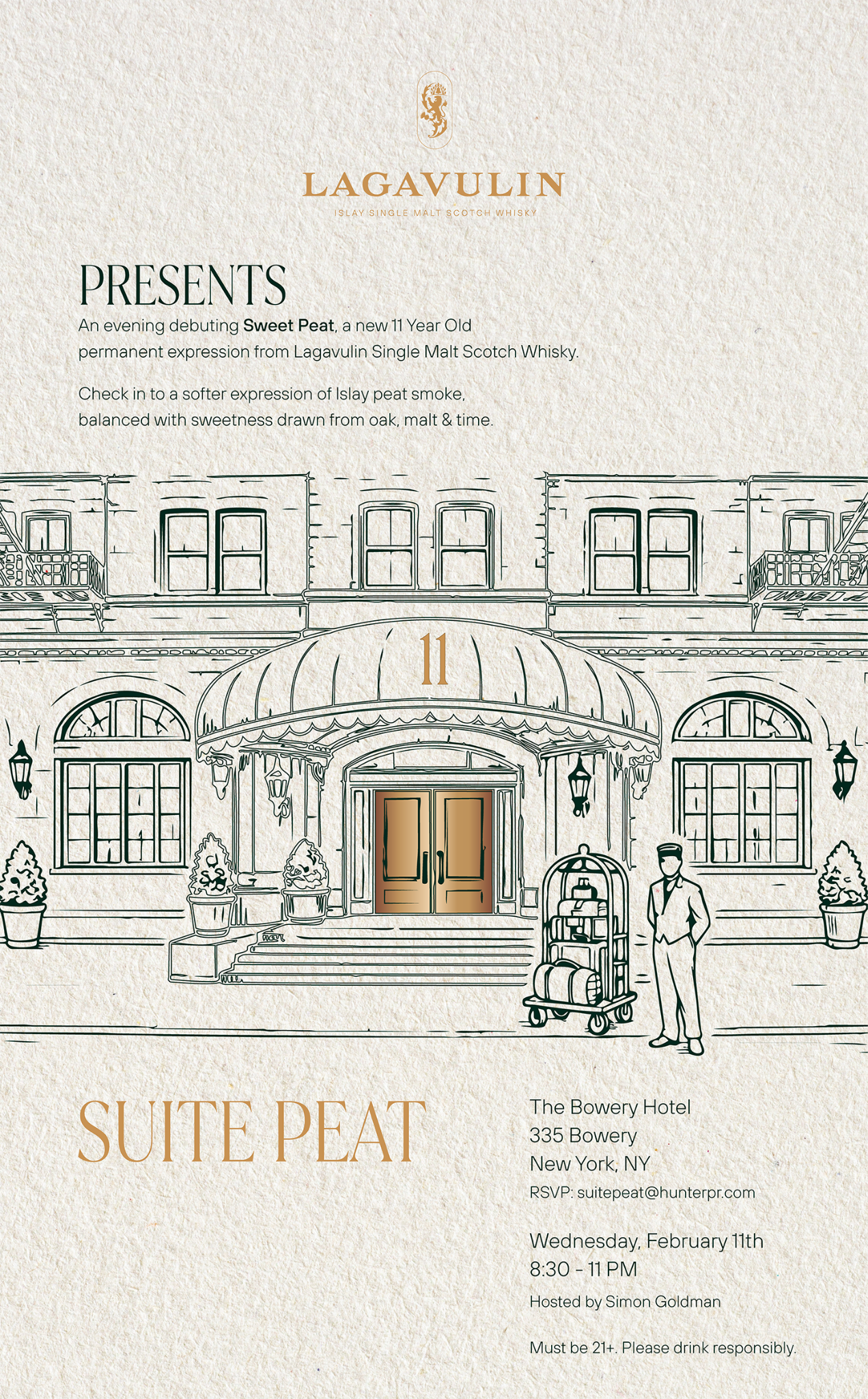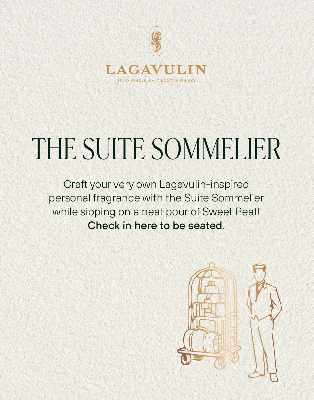 NVE CREATIVE DIRECTOR We transformed Lagavulin’s Sweet Peat launch into “Suite Peat,” an immersive hotel-inspired world unveiled during New York Fashion Week. Through theatrical hospitality, interactive scent rituals, and elevated signature serves, media and tastemakers experienced the whisky in a layered, fashion-forward setting designed to spark discovery and connection.