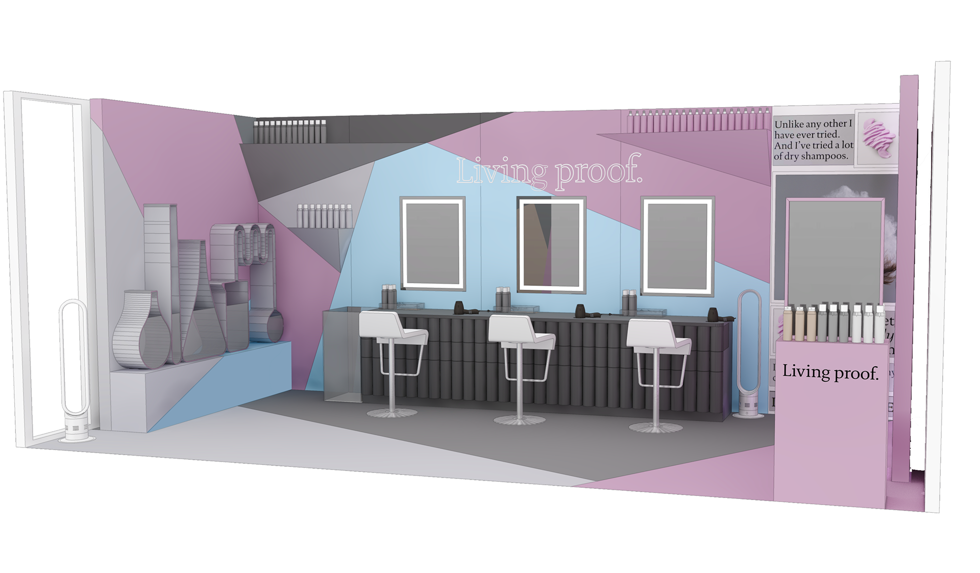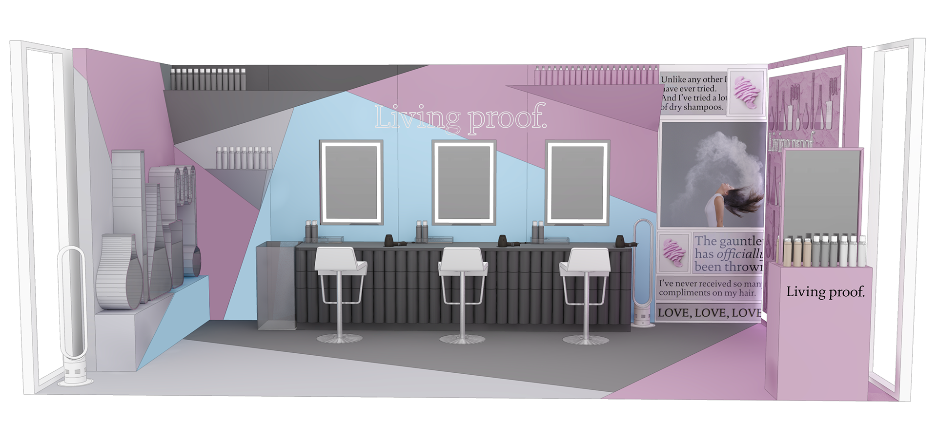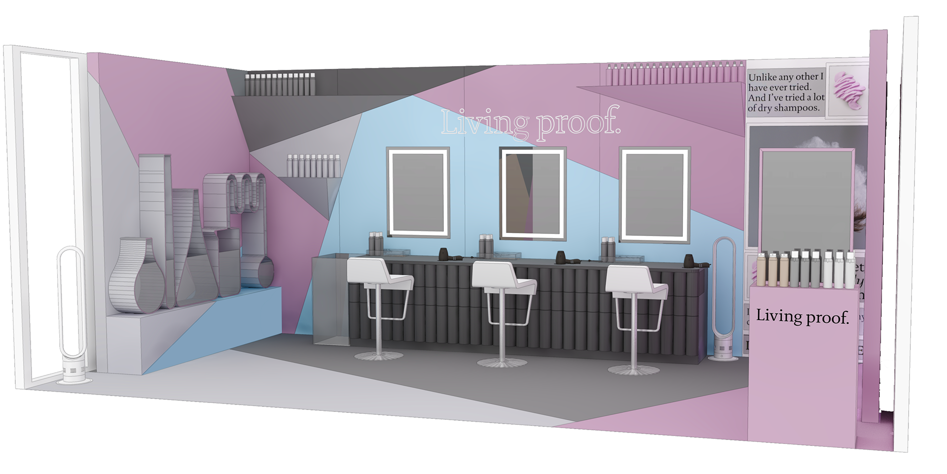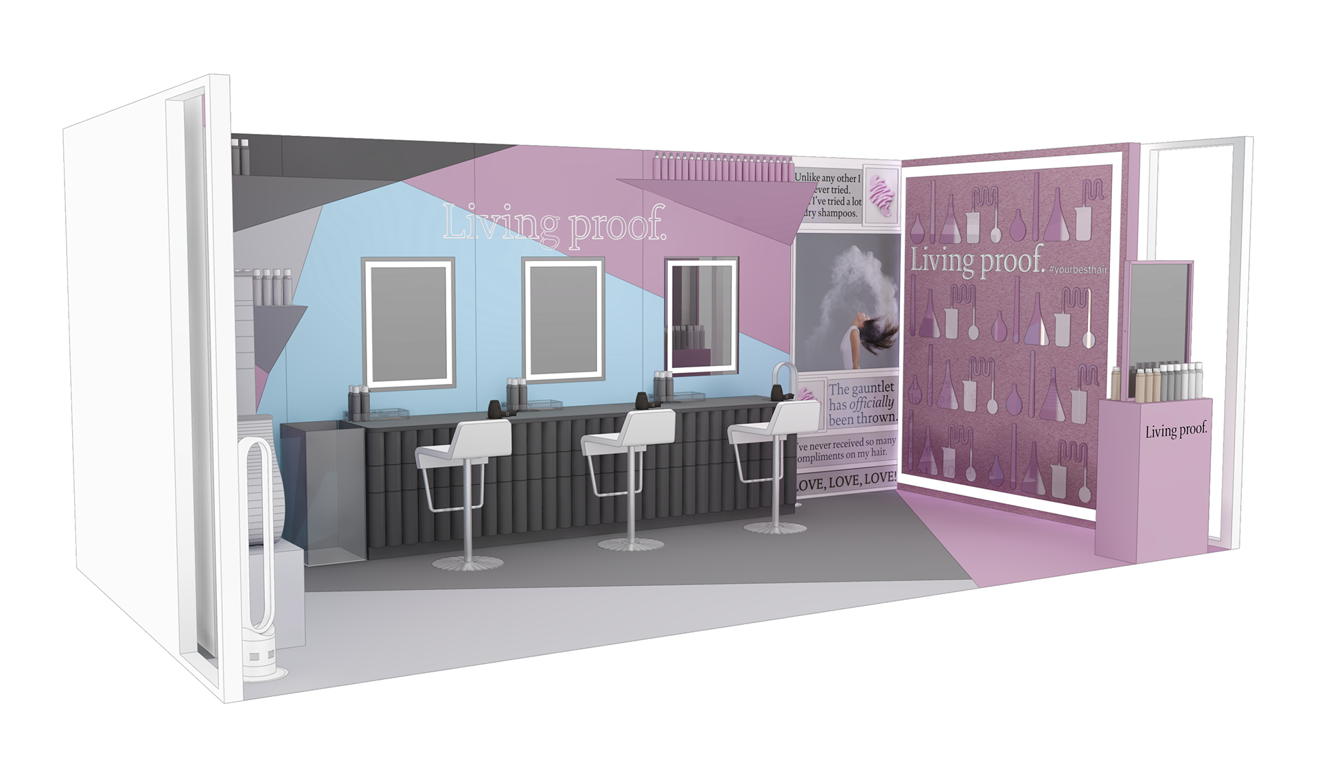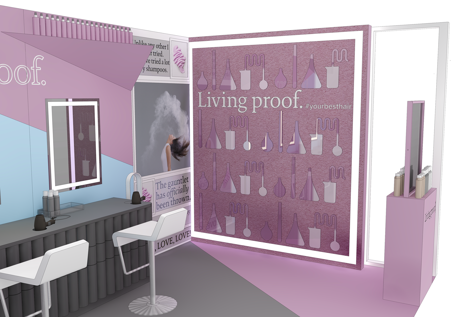 PINK SPARROW DESIGN DIRECTOR We created this custom booth for Living Proof to showcase their brand in action at SEPHORiA: House of Beauty, an annual interactive event giving attendees opportunities to play, shop and learn.
